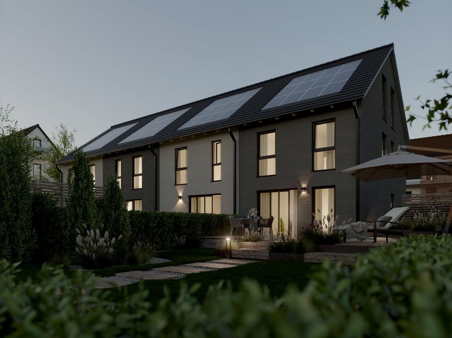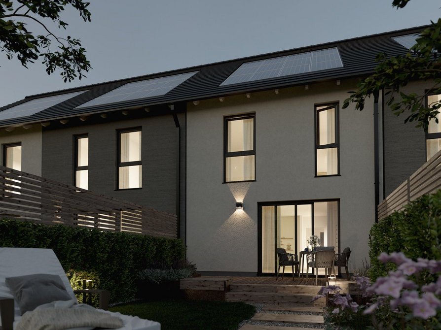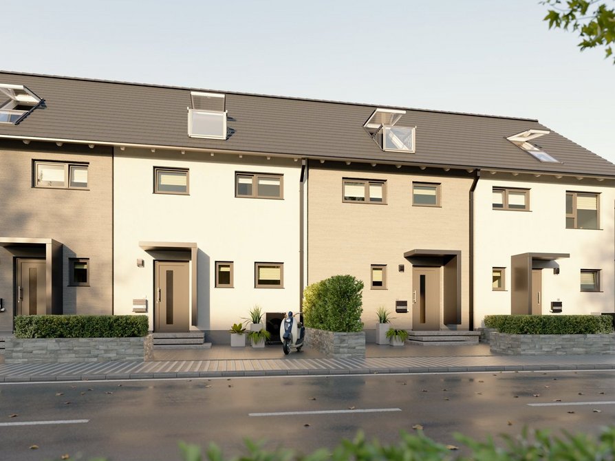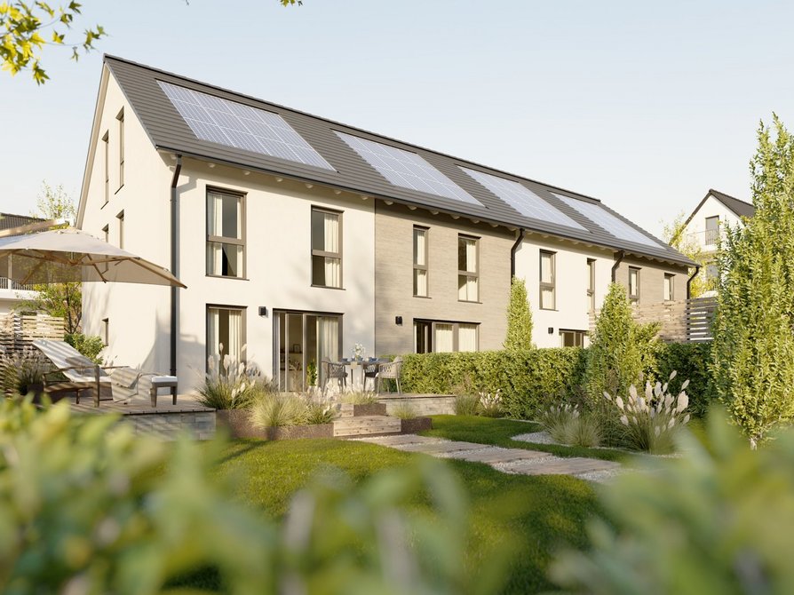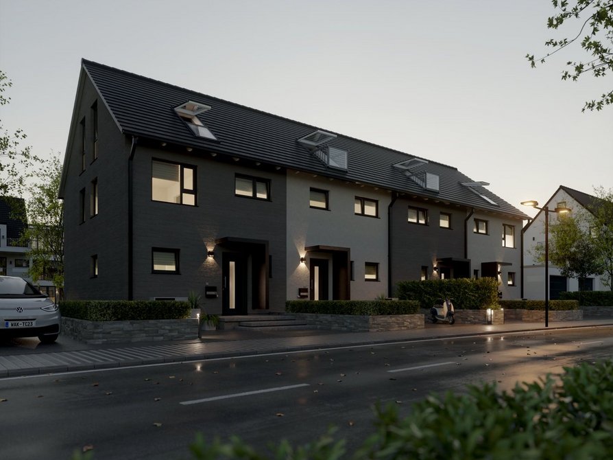 Das Reihenhaus mit vier Wohneinheiten verbindet modernes Design mit einem durchdachten Wohnkonzept. In der Novo-Ausstattung zeigt sich das Haus in klarer Architektur mit großzügigen Fensterflächen, die für lichtdurchflutete Räume sorgen. Jede Einheit bietet rund 140 Quadratmeter Wohnfläche auf drei Etagen und überzeugt mit einer offenen Grundrissgestaltung, die viel Raum für individuelle Wohnideen lässt.