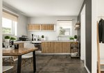 Im Erdgeschoss spielt sich der Alltag in Wohnzimmer und Küche ab, der Übergang zwischen diesen Räumen ist teilweise offen gestaltet. Ein Highlight ist die Abstellkammer direkt neben der Küche, die nicht nur Platz für Leckereien bietet. In zwei weiteren Zimmern finden die Bewohner Raum für sich.