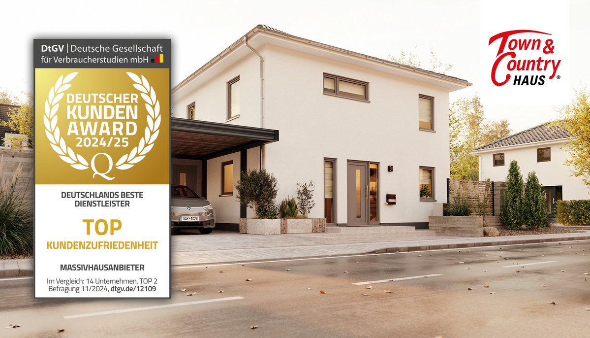 Im Rahmen der unabhängigen Studie "Deutscher Kunden-Award 2024/25" wurde erneut die Crème de la Crème der deutschen Unternehmenslandschaft ermittelt. Dabei konnte Town & Country Haus als Hausanbieter in der Kategorie "Massivhausanbieter" mit Bestnoten überzeugen und die begehrte Auszeichnung für TOP Kundenzufriedenheit für sich gewinnen. Ein herausragender Erfolg, der unsere kontinuierlichen Bemühungen um Kundenservice und Qualität im Hausbau widerspiegelt. Diese Auszeichnung zeigt, dass unser Engagement für exzellente Beratung, zuverlässige Bauabwicklung und nachhaltige Qualität von unseren Kunden geschätzt wird. Für Bauherren, die auf der Suche nach einem vertrauensvollen und erfahrenen Hausanbieter sind, ist dies ein klares Zeichen.